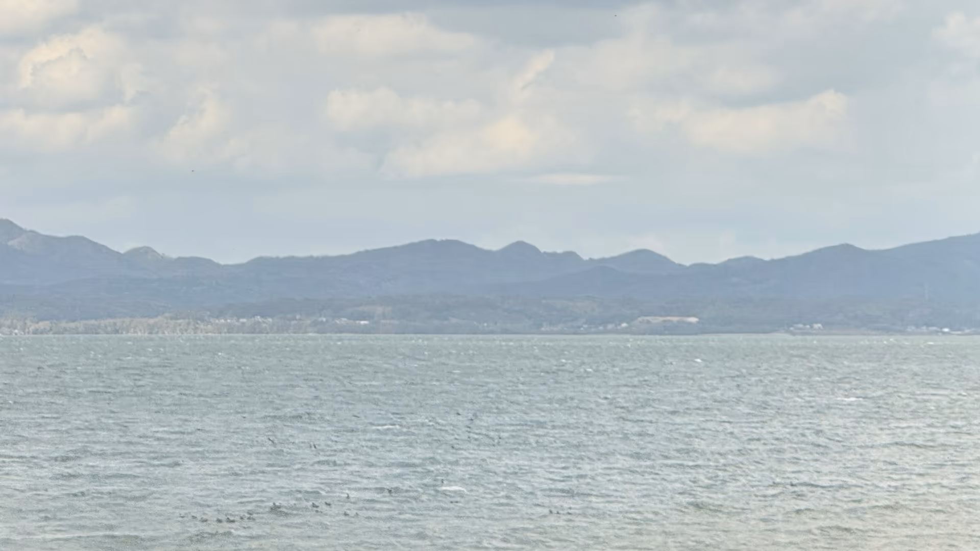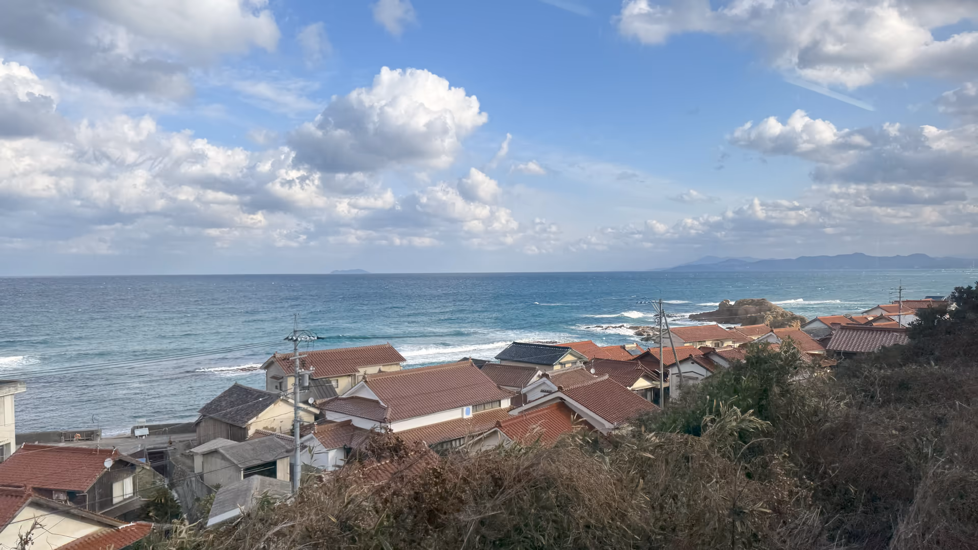 夜が明けると海側に陸地が見えてきます。向津具(むかつく)半島というらしいです。
