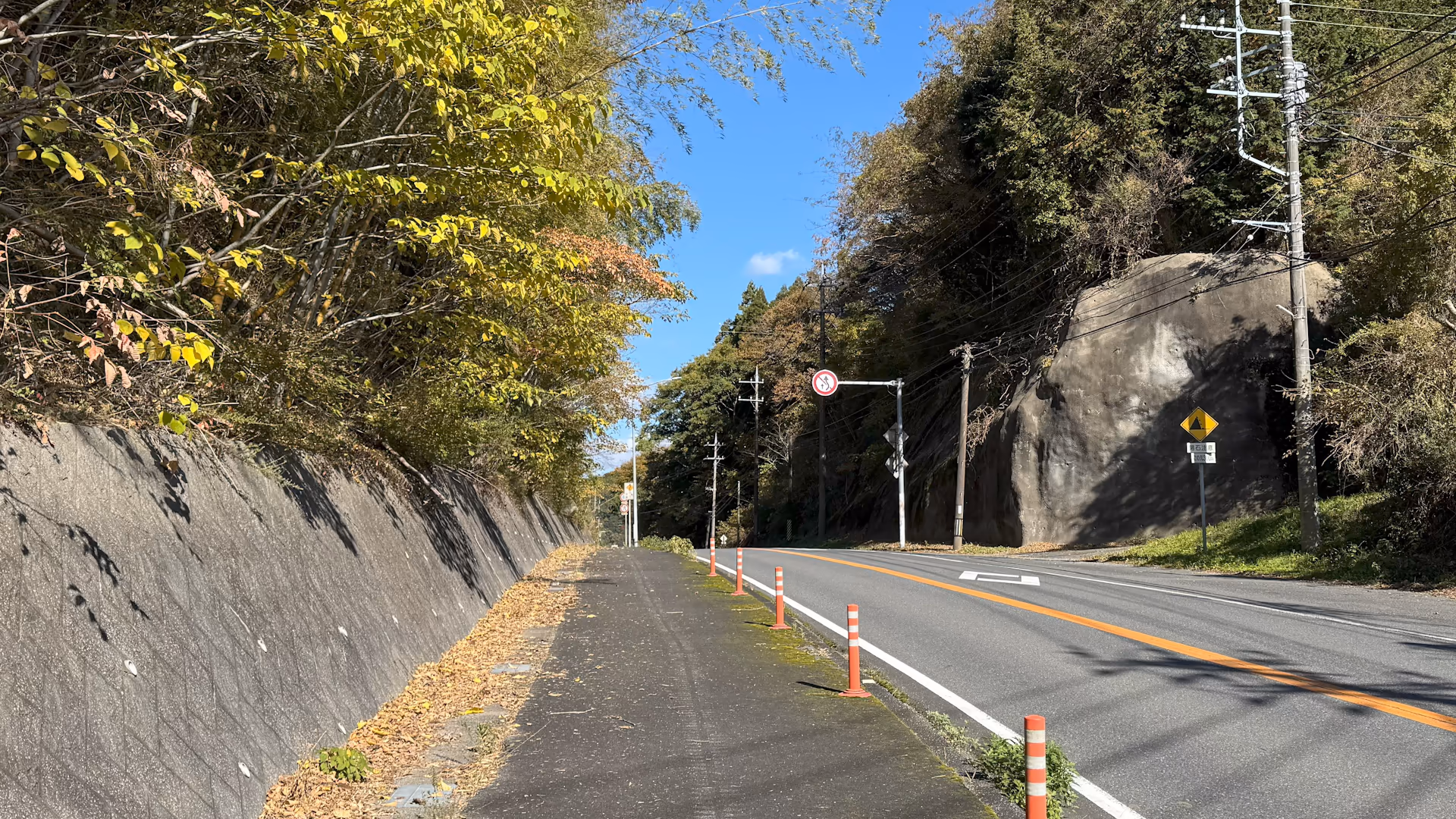 とにかくこのあたりの道路には歩道が一切ありません。交通量が多いわけではないですが、少なくない数の自動車が通過していくので結構危ないです。多分ハイキングの道順には含まれていないと思います。
